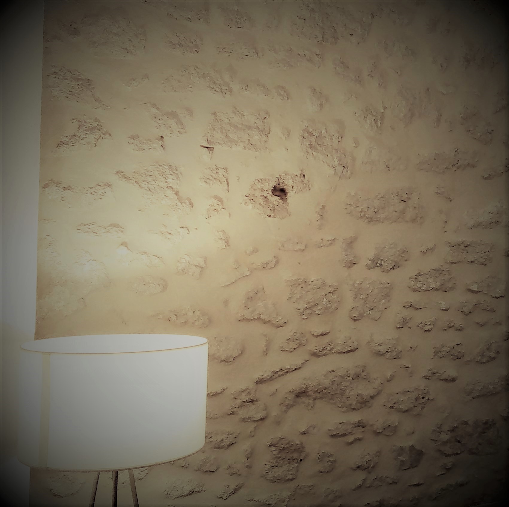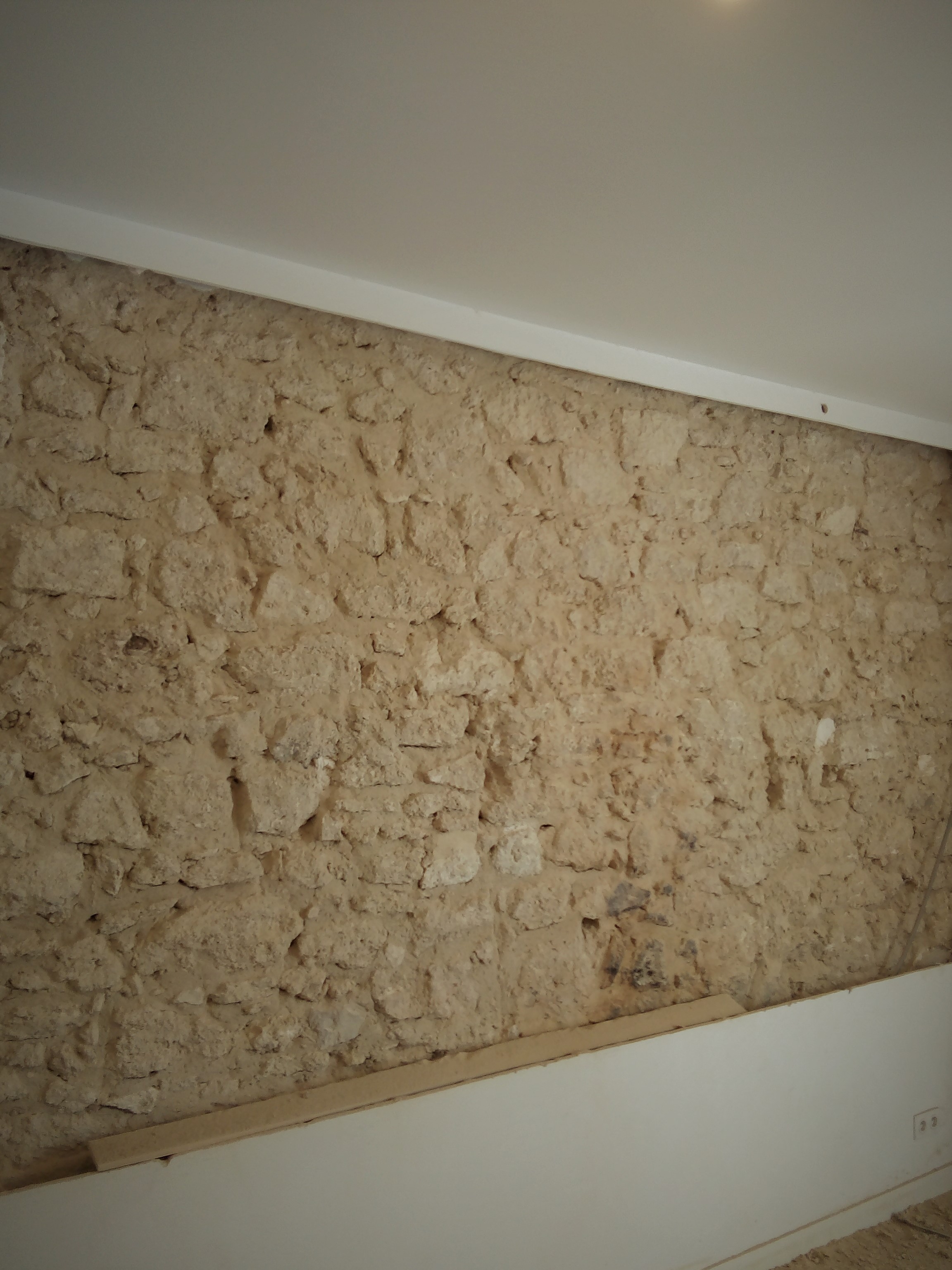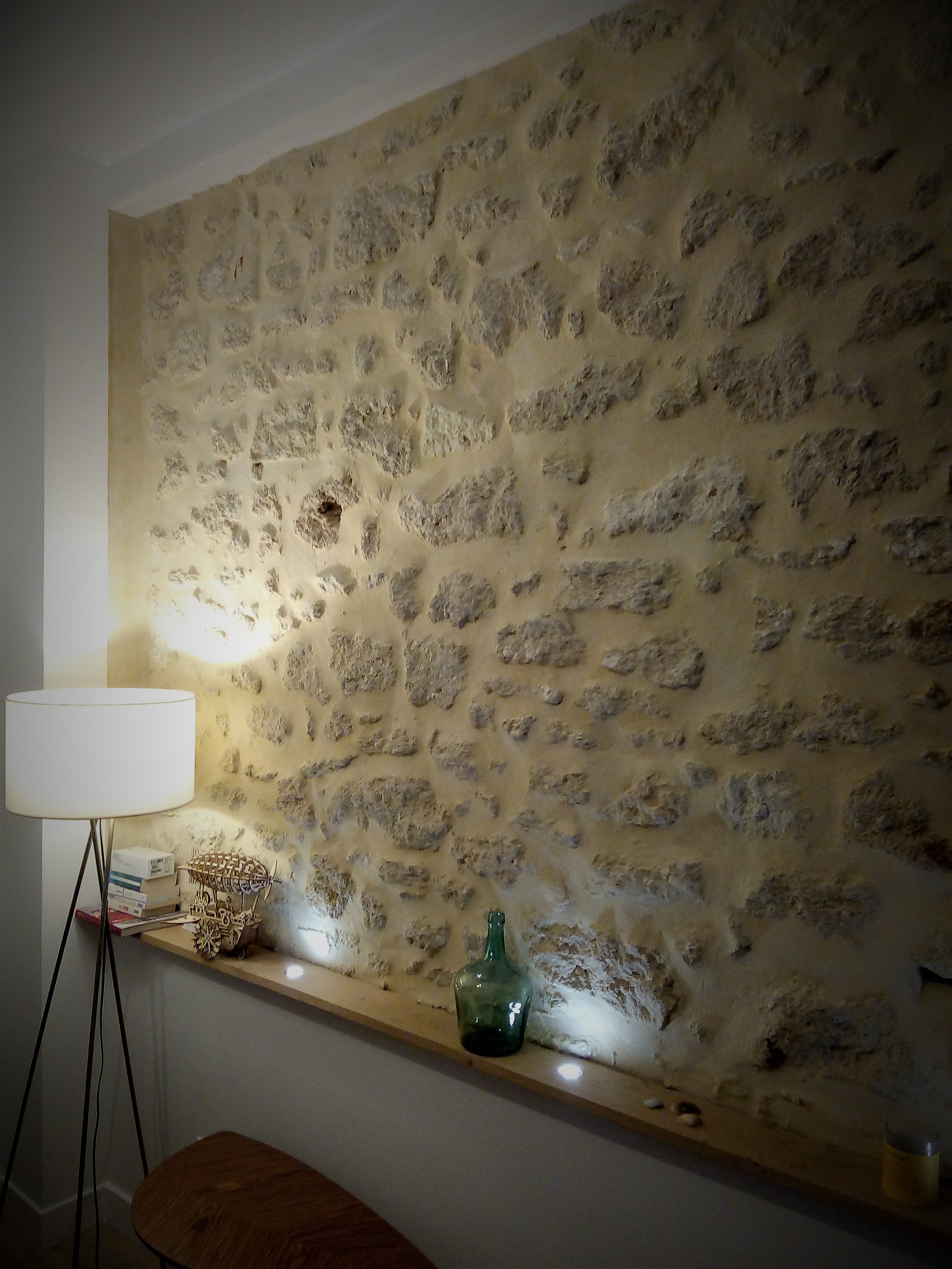 Le client en question désirait redonner du cachet à son intérieur, intérieur recouvert de plaques de placo et d’une peinture acrylique blanche. Je lui ai donc proposé de retirer une partie de ce placo dans son salon et de lui créer une fenêtre ouverte sur l’authenticité.