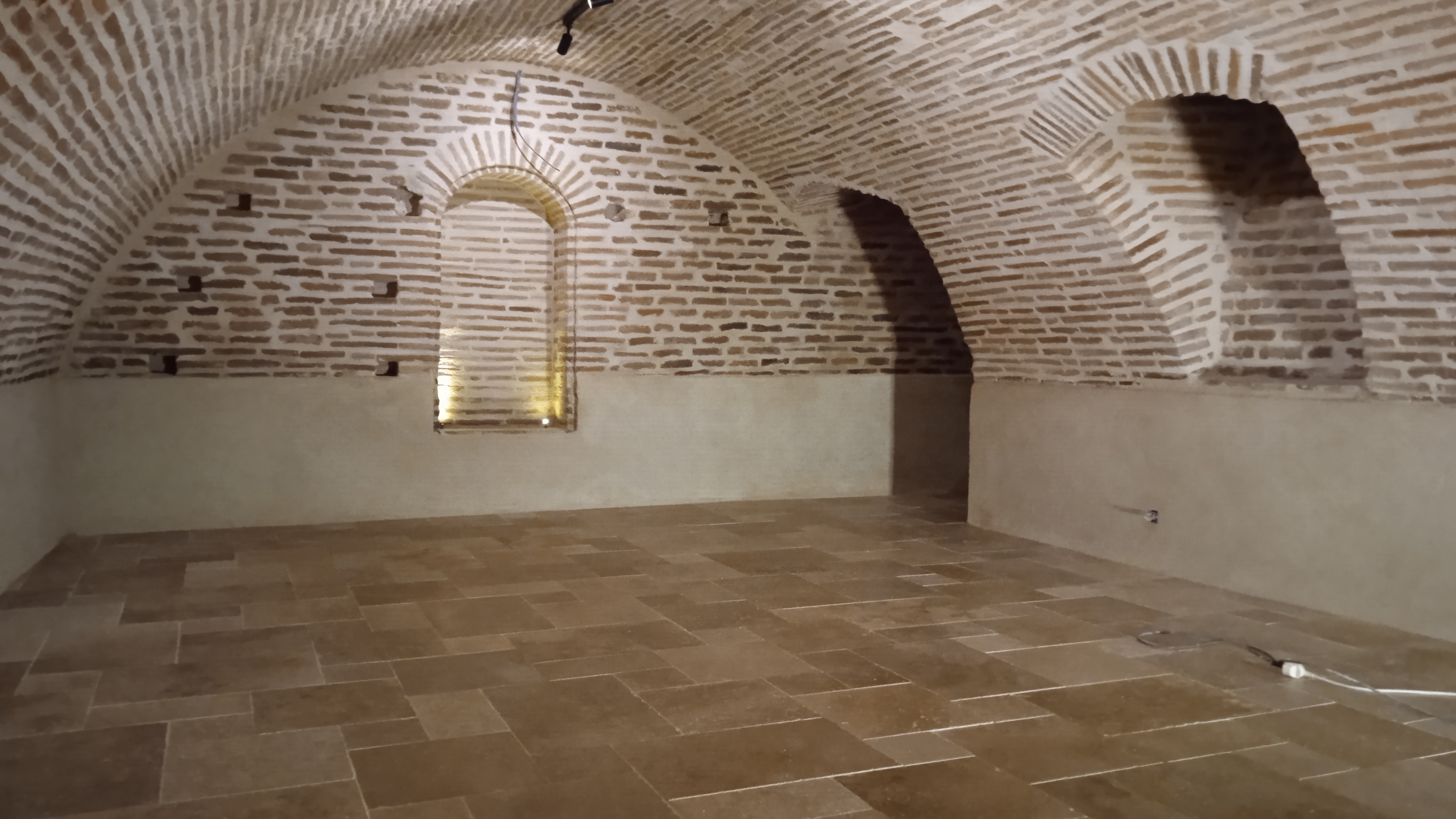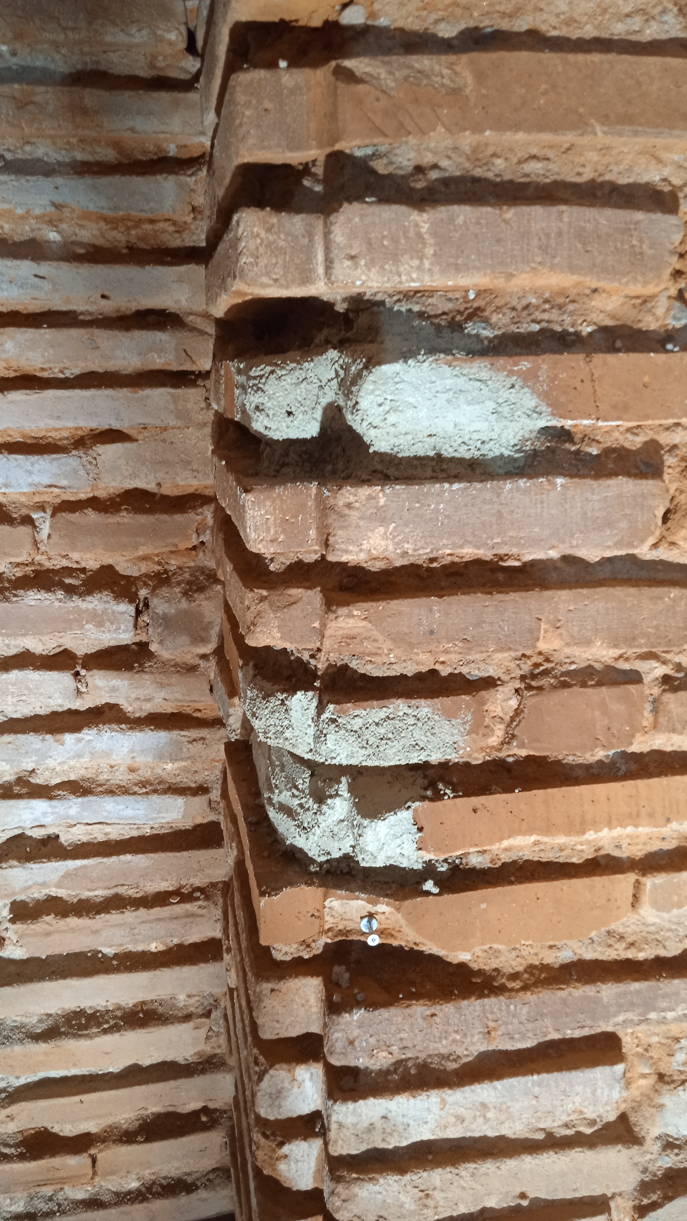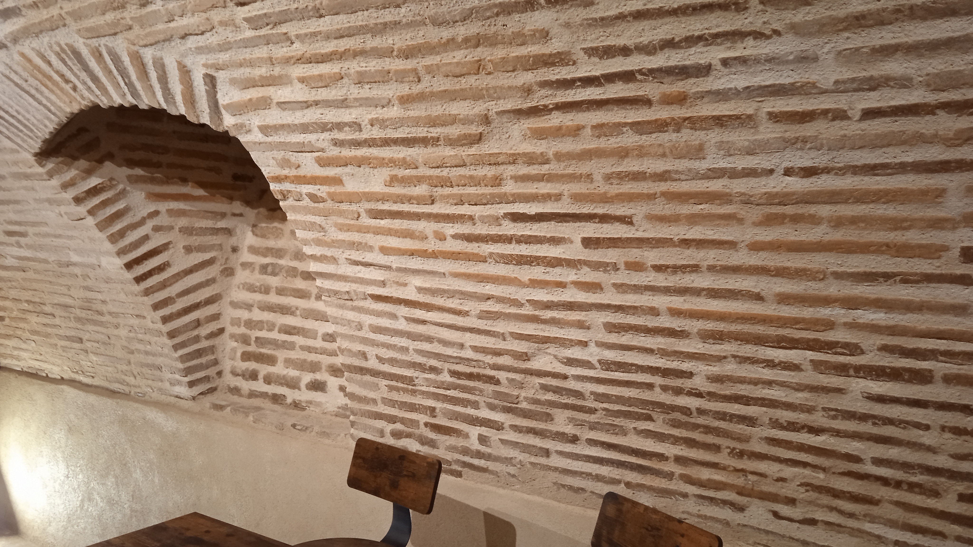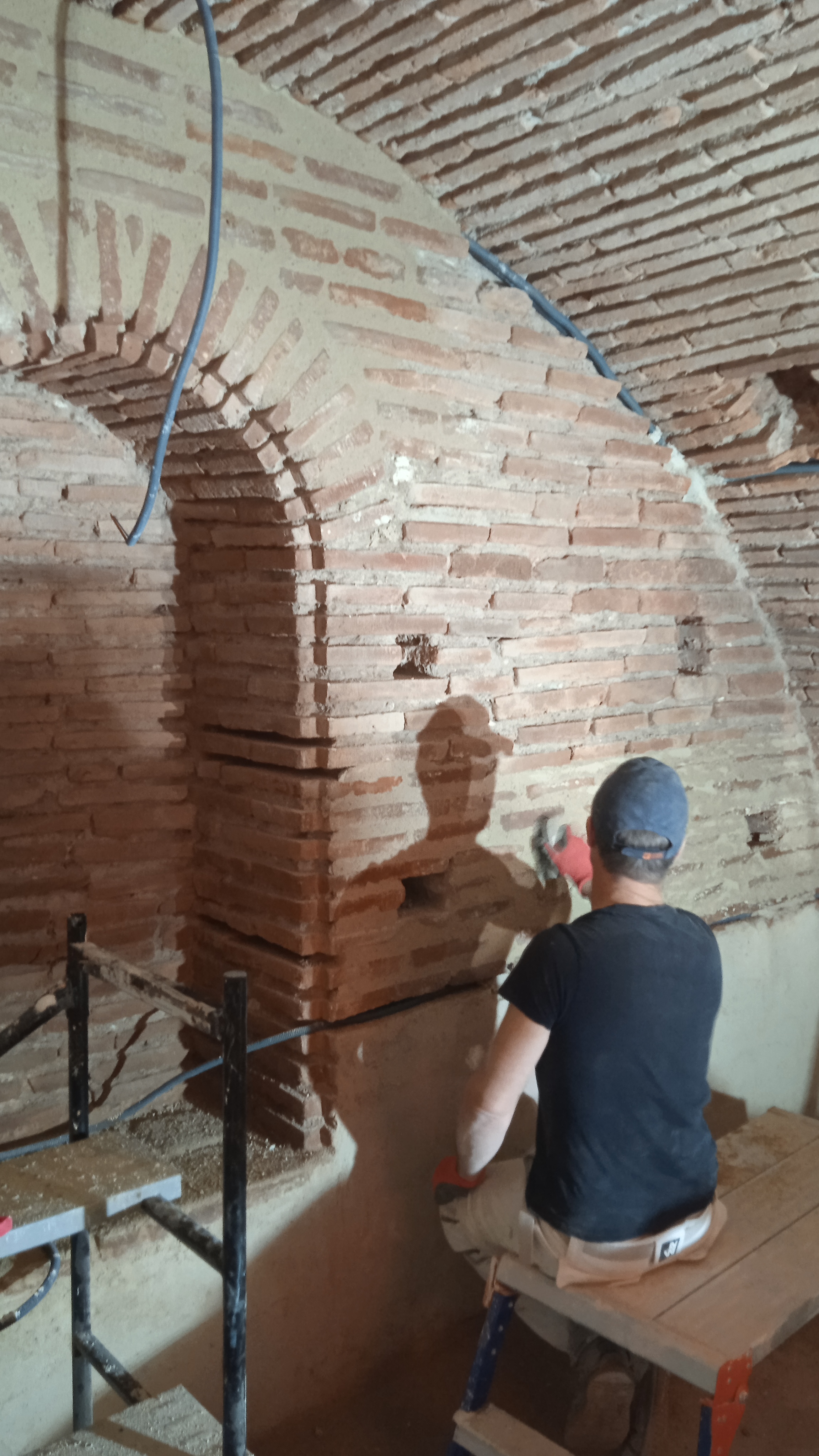 Nettoyage des briques et traitement. Réparation des briques endommagées(alcôves). Rejointoiement traditionnel avec mélange chaux blanche NHL et sable roux.