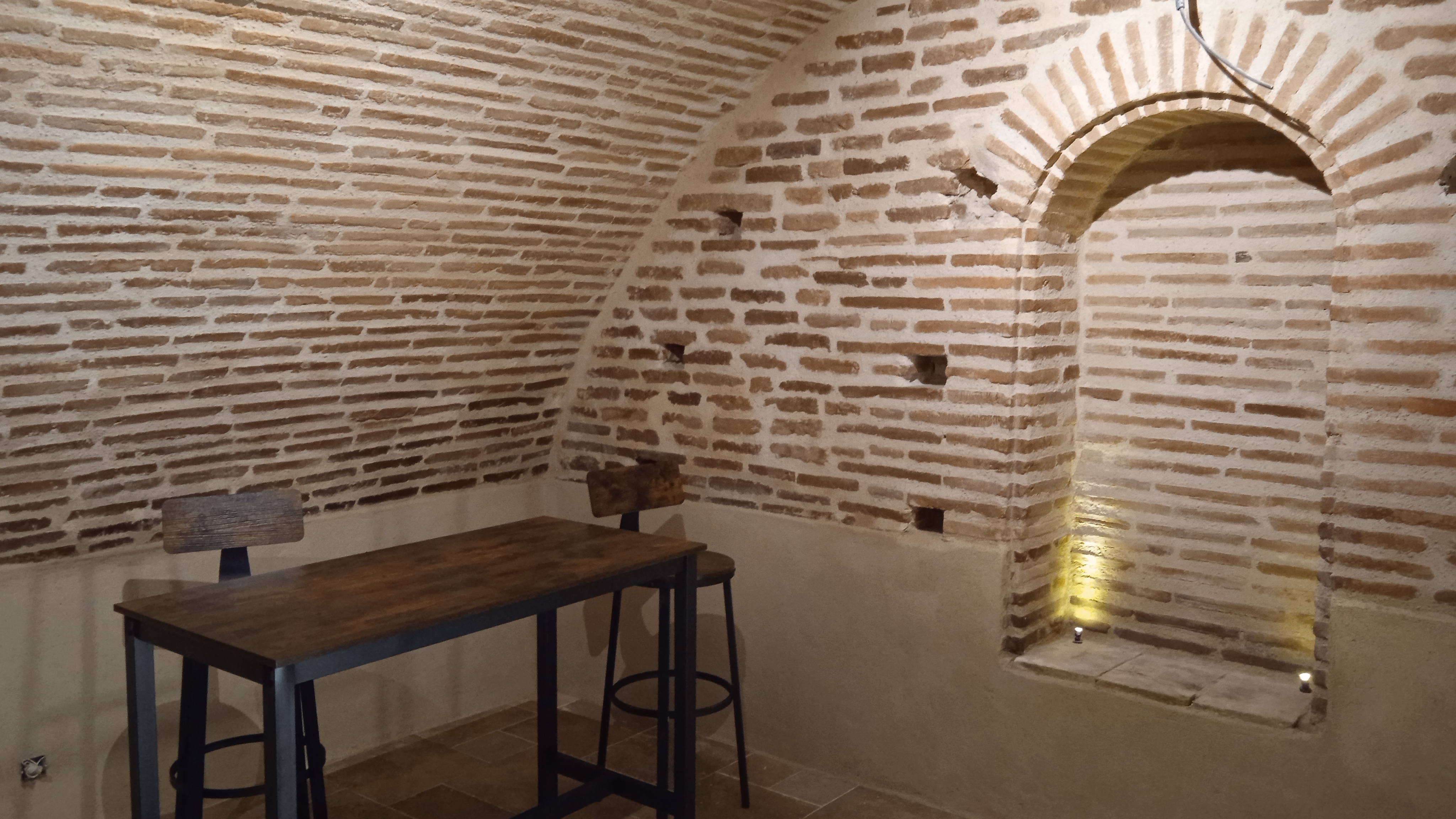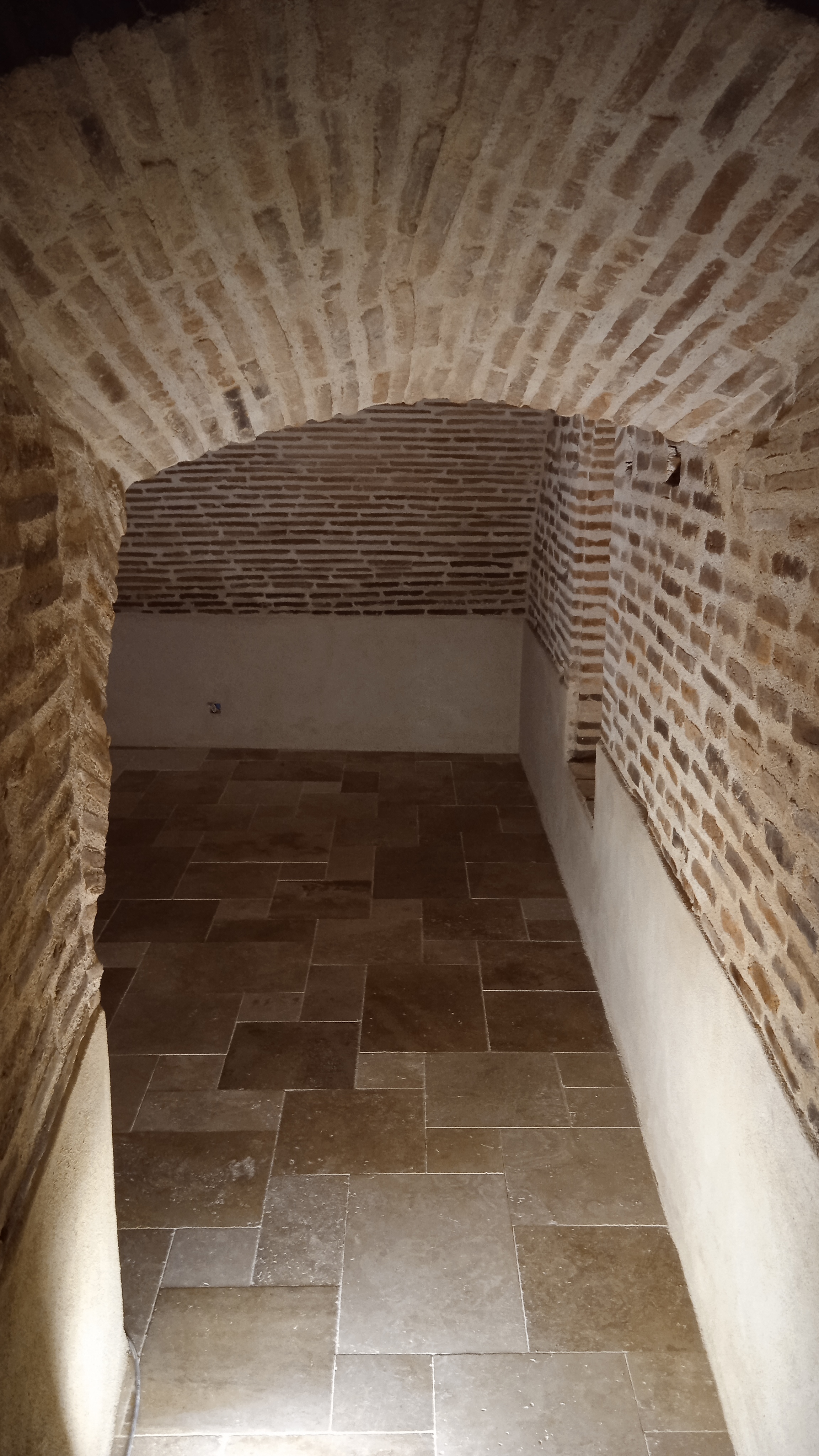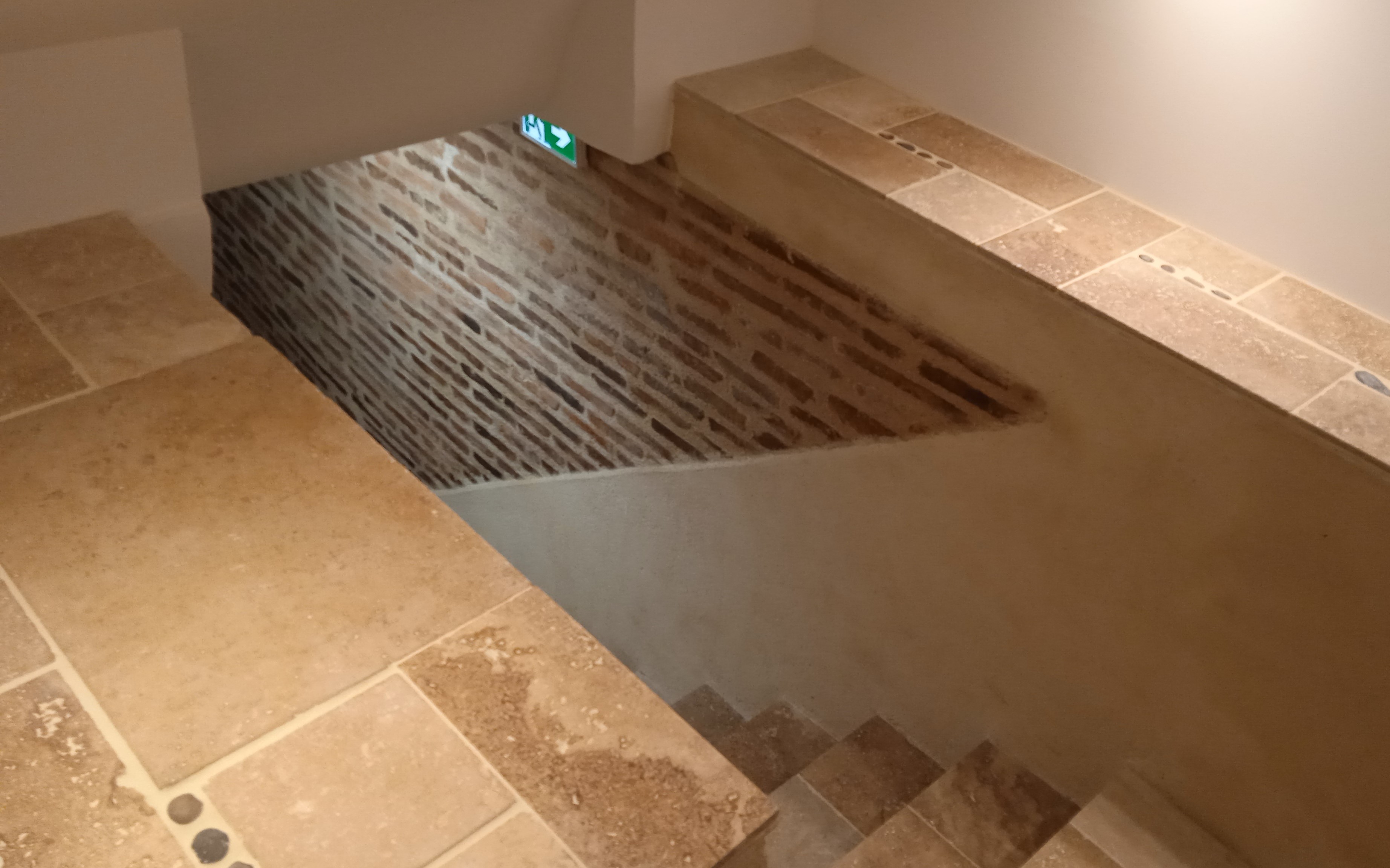 Nettoyage des briques et traitement. Réparation des briques endommagées(alcôves). Rejointoiement traditionnel avec mélange chaux blanche NHL et sable roux.